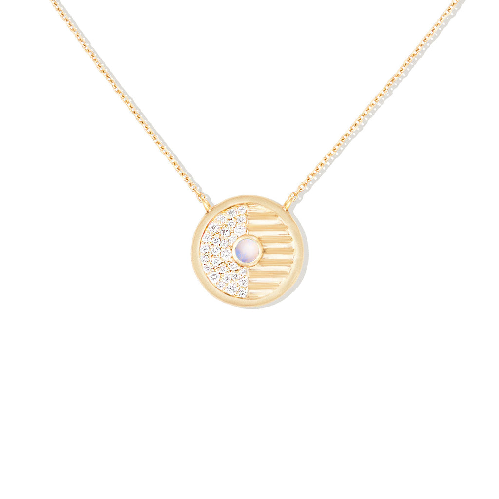 14 Karat Yellow Gold Found Small Disc necklace with moonstone & Diamonds