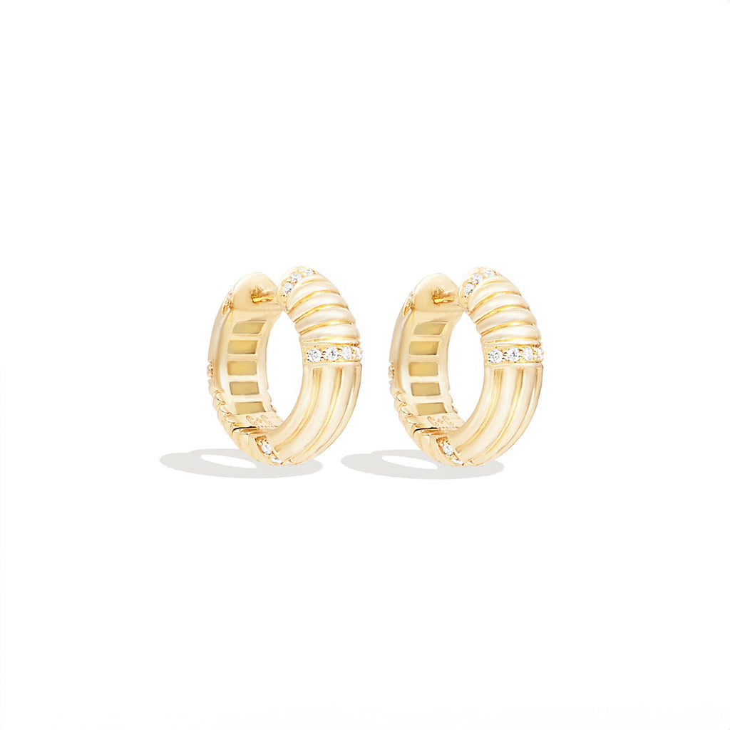 14 Karat Yellow Gold Round Ribbed Huggy Diamond Earrings